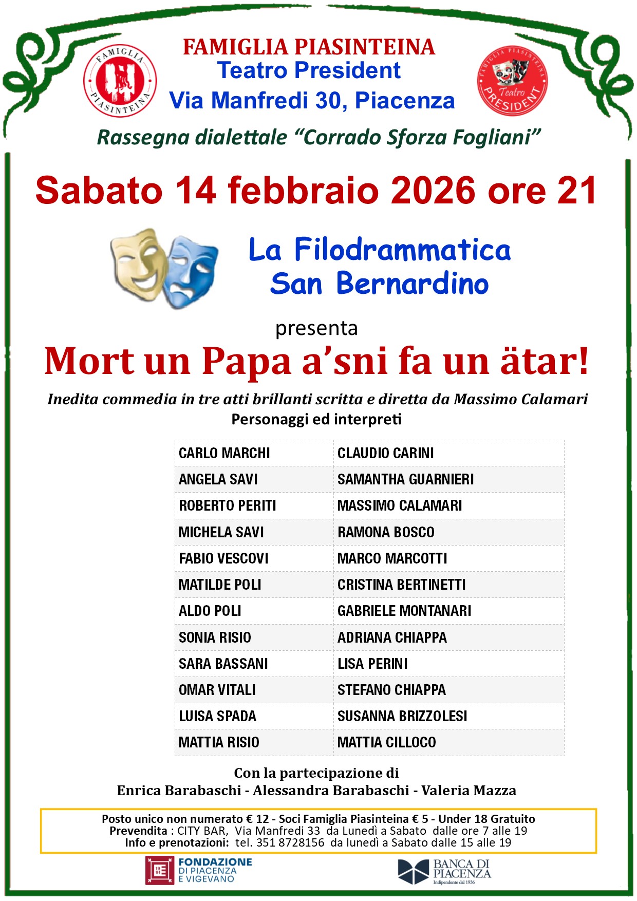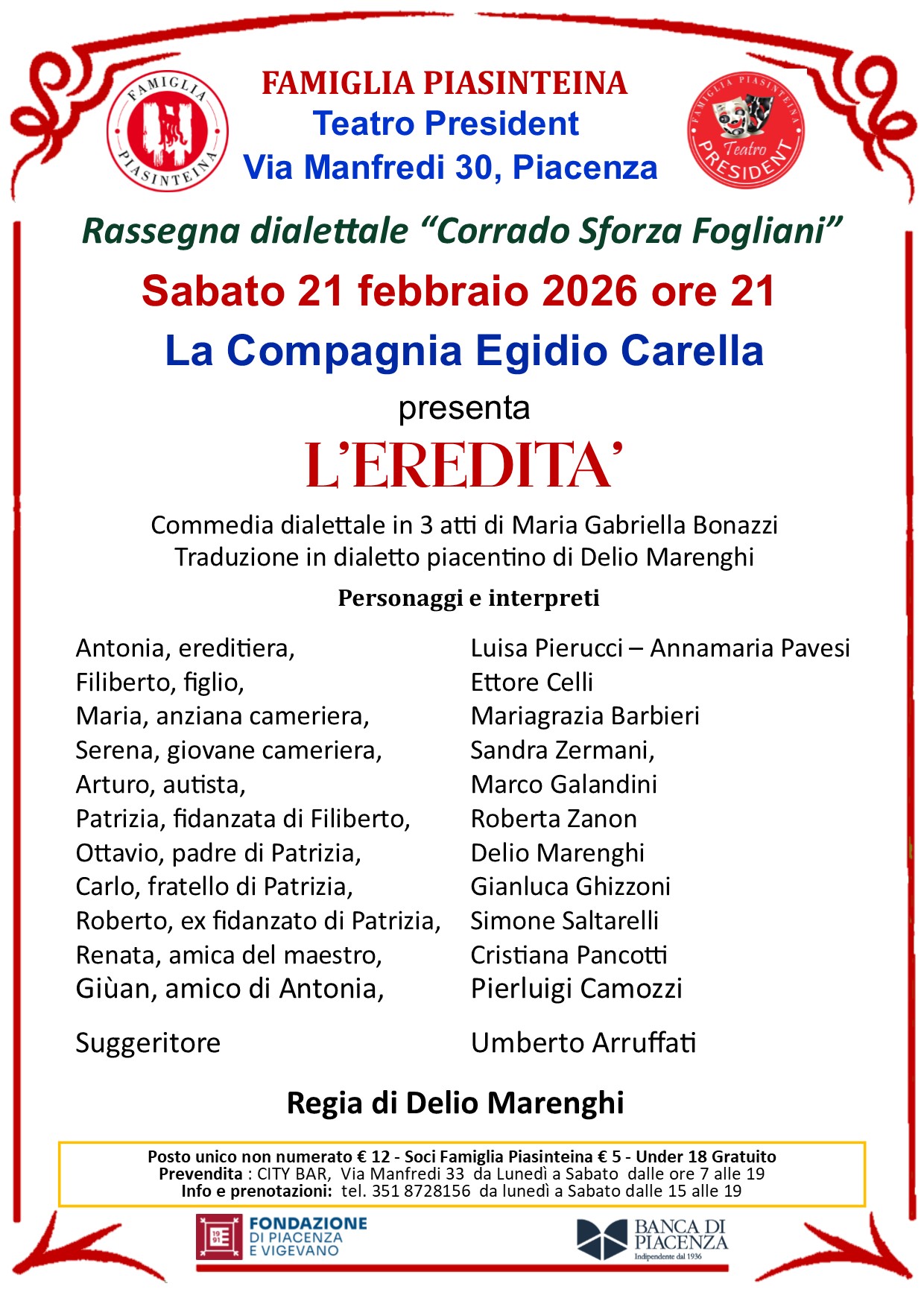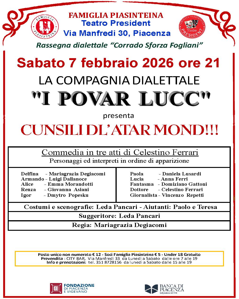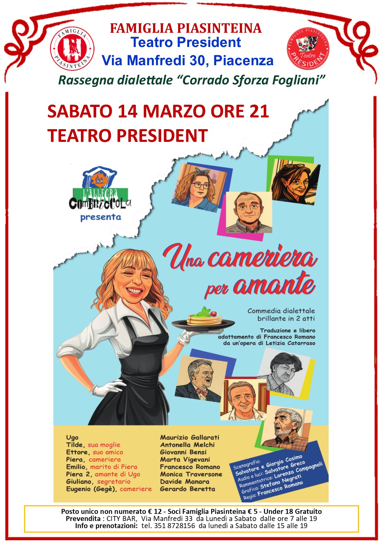 Via Manfredi n. 30, 29122 Piacenza – Tel. 351 8728156 da lunedì a sabato dalle 15 alle 19 – Email: teatropresident.pc@gmail.com